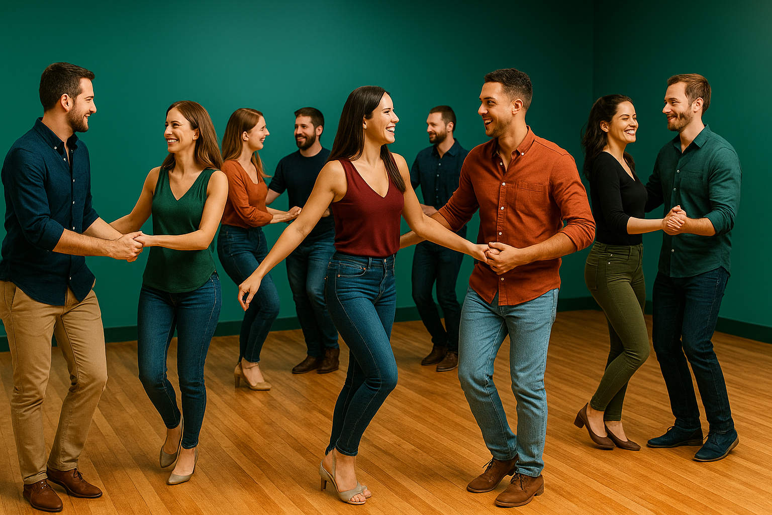¡Baile en grupo! Cambiamos de pareja con “llamadas” del profe. Social, dinámica y adictiva. Mucha risa, ritmo y compañerismo.