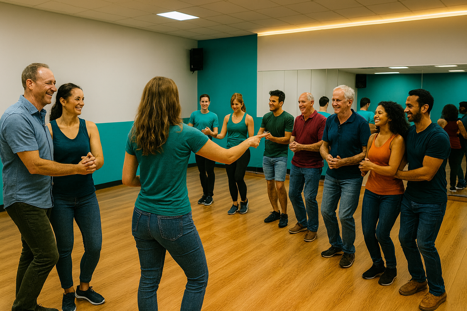 ¡Baile en grupo! Cambiamos de pareja con “llamadas” del profe. Social, dinámica y adictiva. Mucha risa, ritmo y compañerismo.